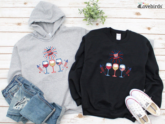 4th of July Wine Glasses Hoodie, Wine USA Flag Sweatshirt, Wine Lover Long Sleeve Shirt, Independence Day Shirt, 4th of July Gifts