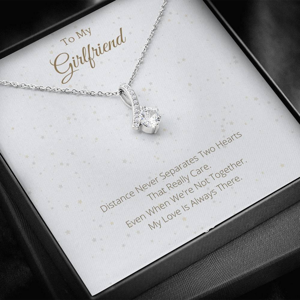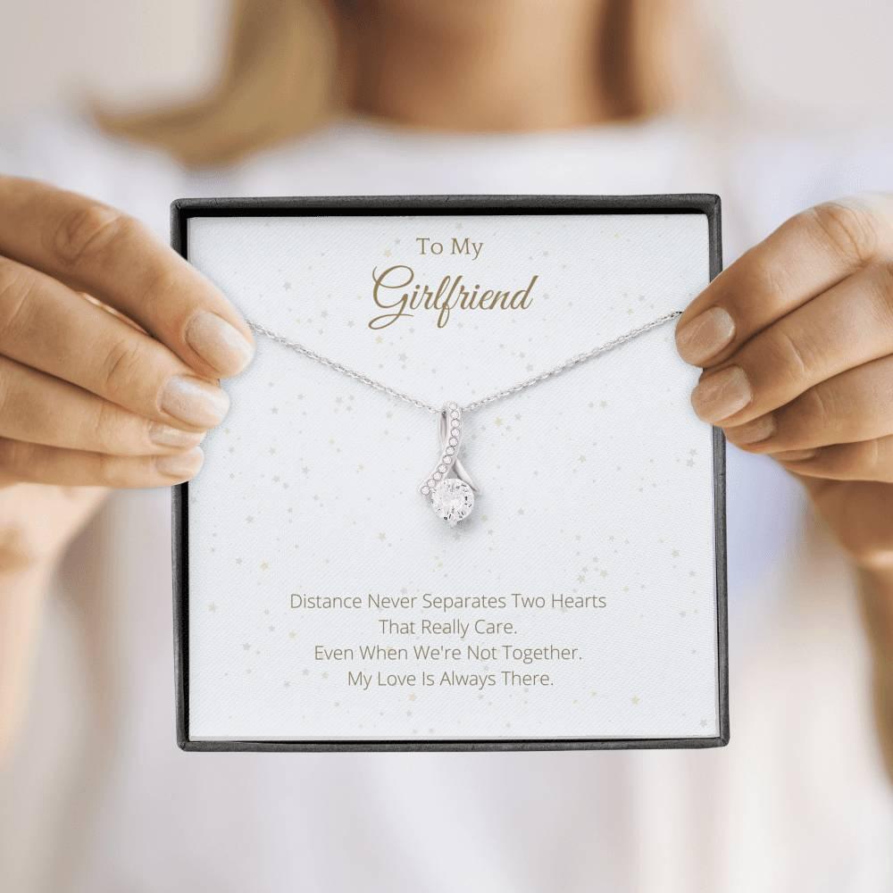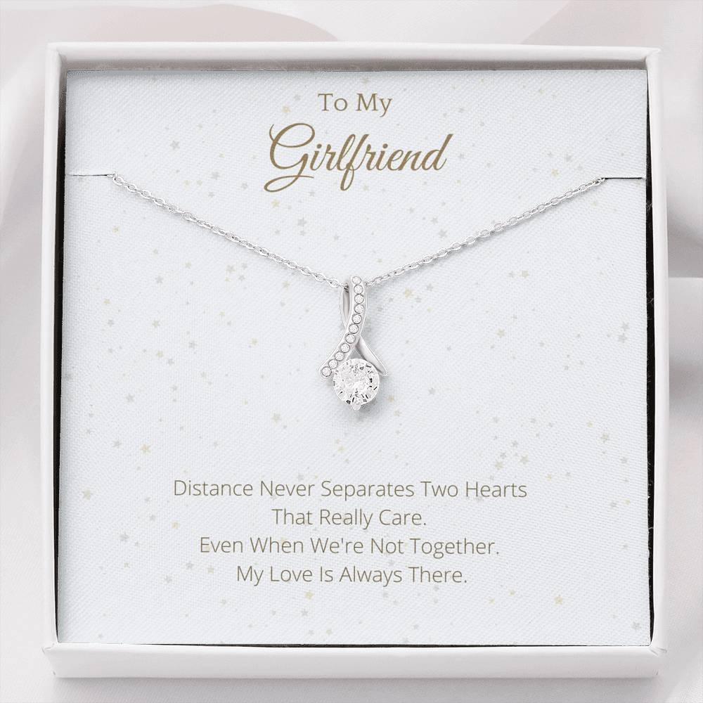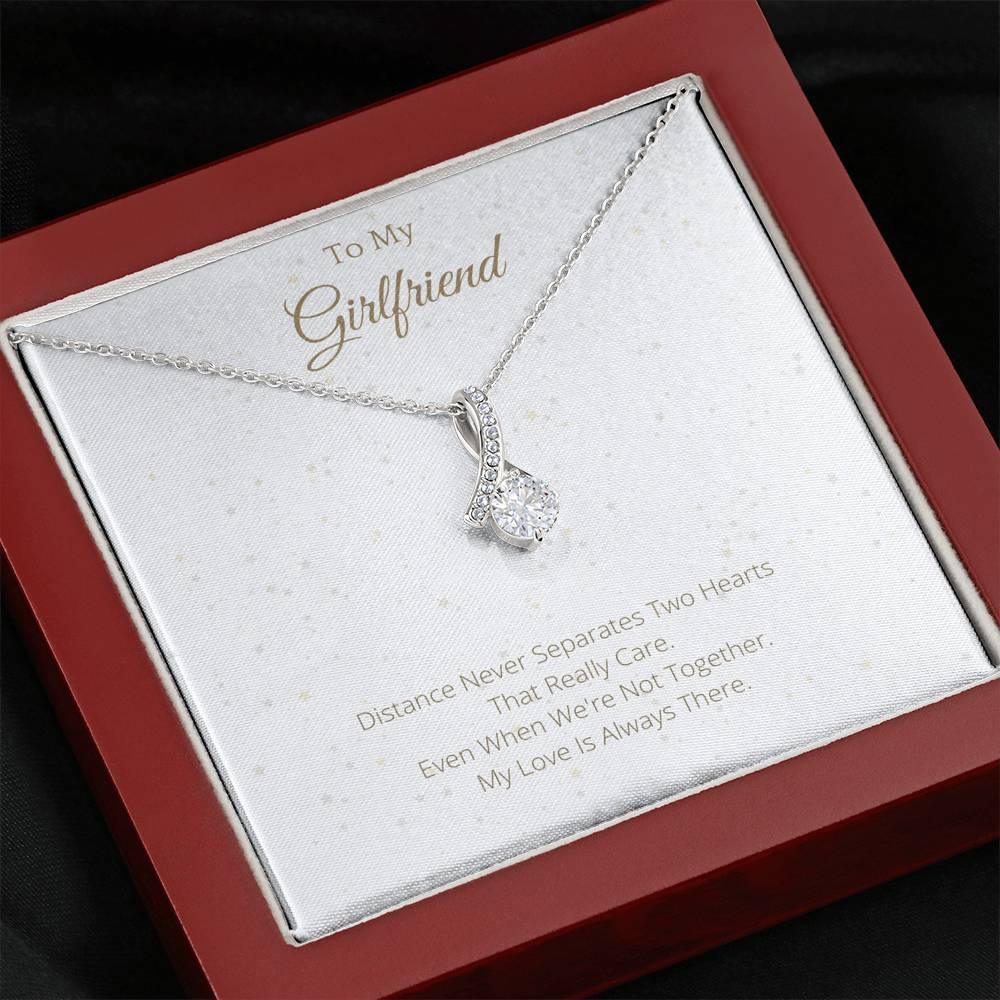 Melt her heart with this ALLURING BEAUTY necklace gift! The petite ribbon shaped pendant is finished with 14K white gold over stainless steel, and is embellished with dainty clear crystals surrounded by a sparkling 7mm round cut Cubic Zirconia.