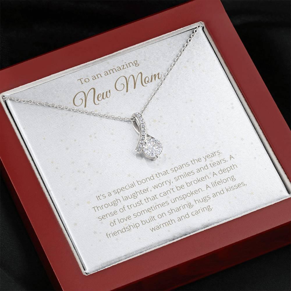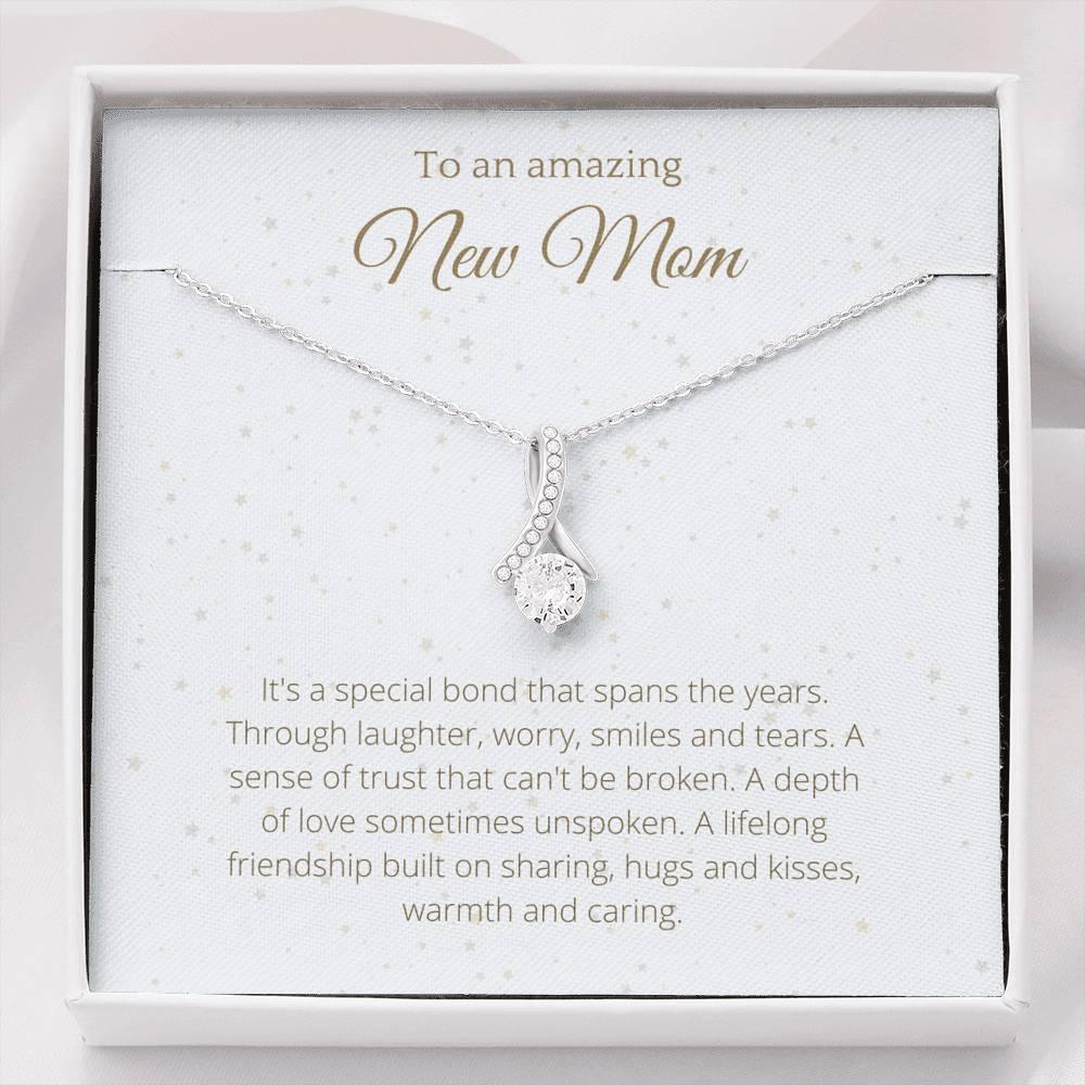 Melt her heart with this ALLURING BEAUTY necklace gift! The petite ribbon shaped pendant is finished with 14K white gold over stainless steel, and is embellished with dainty clear crystals surrounded by a sparkling 7mm round cut Cubic Zirconia.