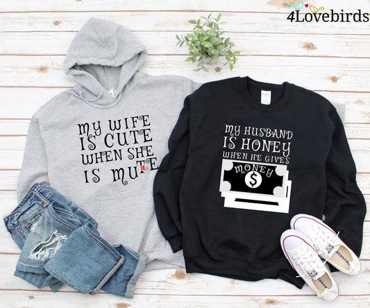 My Wife Is Cute When She's Mute/My Husband Is Honey When He Gives Money Matching Hoodie, Funny Matching Shirts, Honeymoon Shirts, Gifts