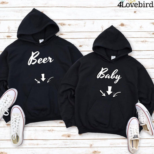 Matching Couple Pregnancy Outfits: Baby/Beer Hoodie & Pregnancy Reveal Shirts - Perfect Pregnancy Gift.
