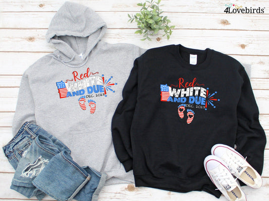 Custom Red White and Due 4th of July Pregnancy Announcement Hoodie, Matching Fourth of July Gender Reveal Sweatshirts, Personalized Shirts