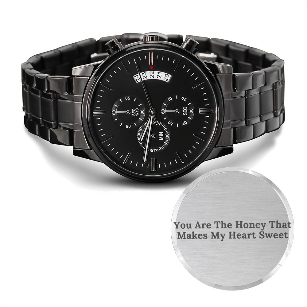 A personalized gift that can withstand constant use, this Engraved Design Black Chronograph Watch is the perfect gift for all the special men in your life. A thoughtful groomsmen gift, an anniversary memento, or a long-lasting keepsake for Father’s Day - it's a versatile piece sure to warm hearts and create smiles. Featuring a three-dial face, calendar function, and luxury pointer in a water-resistant and scratch-proof vessel.