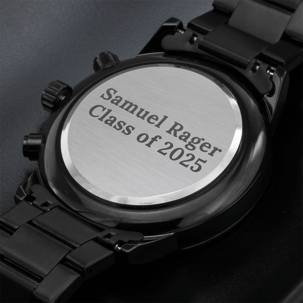 A personalized gift that can withstand constant use, this Engraved Design Black Chronograph Watch is the perfect gift for all the special men in your life. A thoughtful groomsmen gift, an anniversary memento, or a long-lasting keepsake for Father’s Day - it's a versatile piece sure to warm hearts and create smiles. Featuring a three-dial face, calendar function, and luxury pointer in a water-resistant and scratch-proof vessel.