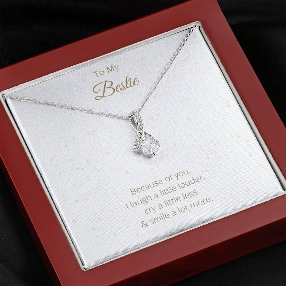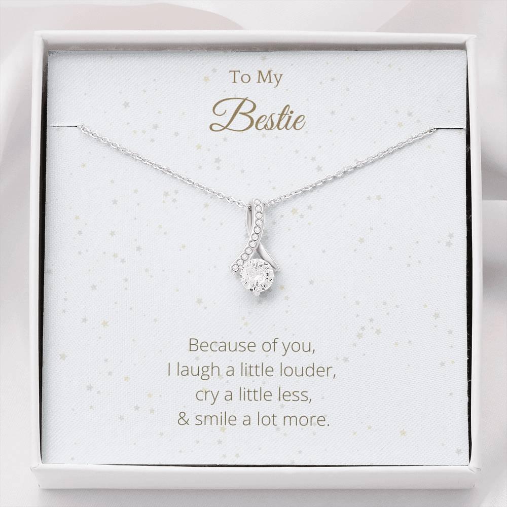 Melt her heart with this ALLURING BEAUTY necklace gift! The petite ribbon shaped pendant is finished with 14K white gold over stainless steel, and is embellished with dainty clear crystals surrounded by a sparkling 7mm round cut Cubic Zirconia.
